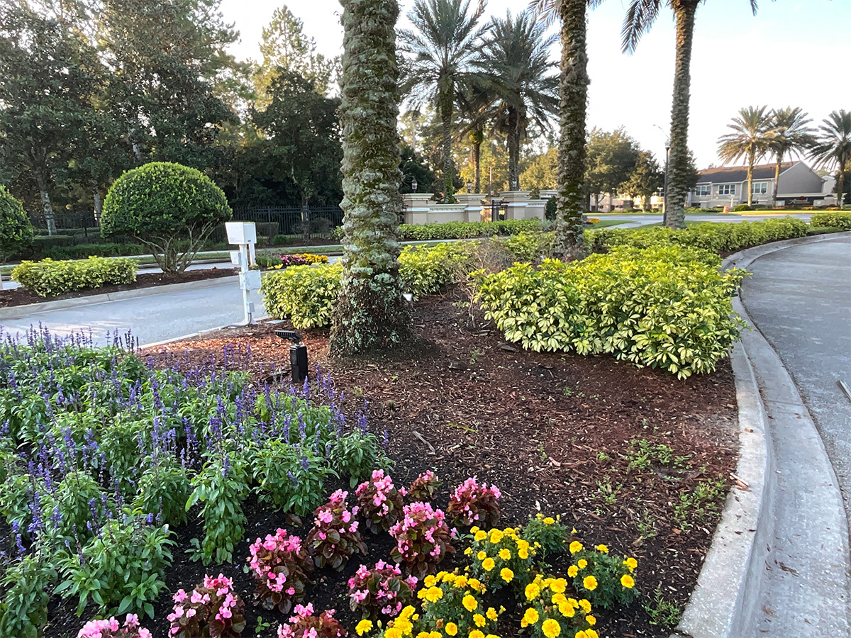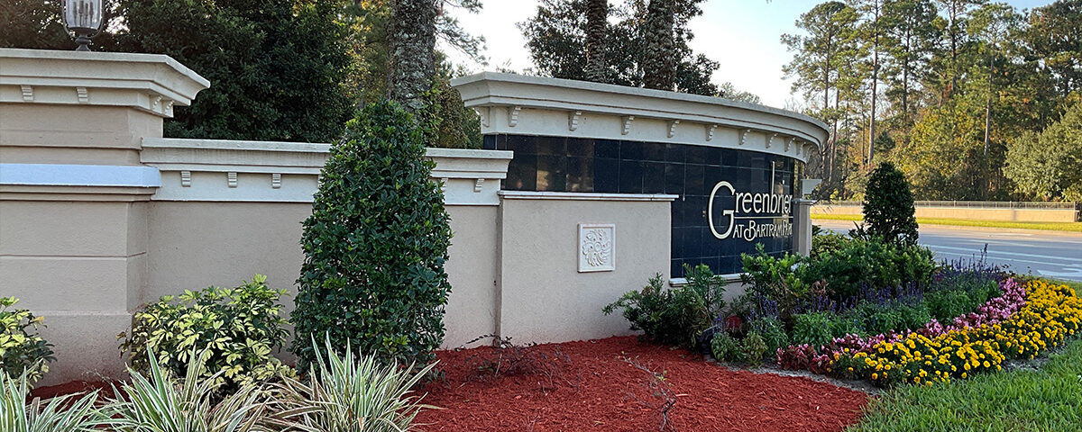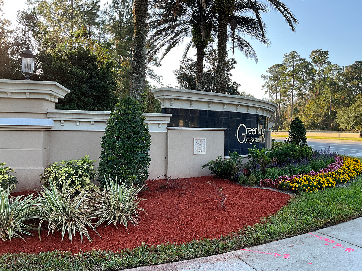 Earlier this year, American GroundPro completed a red mulch installation at The Greenbrier at Bartram, a gated condominium community in Jacksonville. The project focused on refreshing the community’s entrance, creating a polished and welcoming appearance.